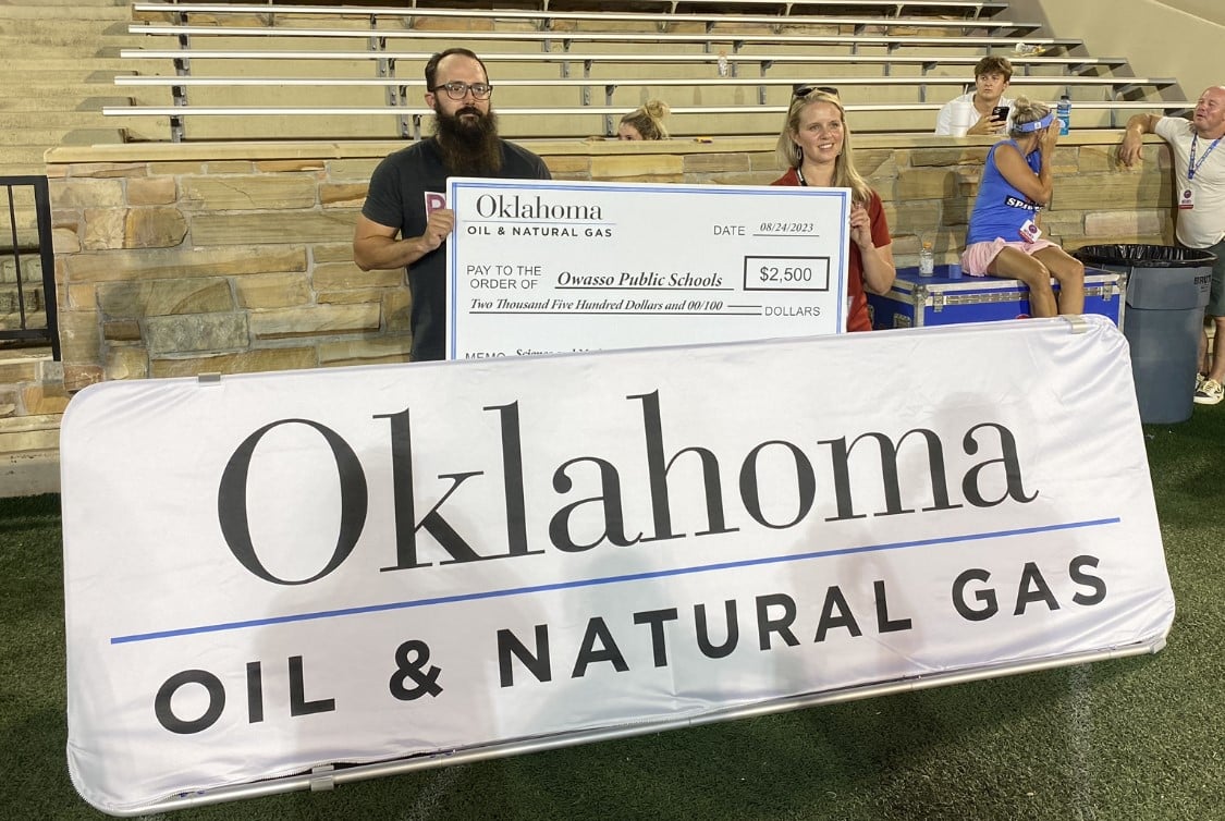 At the Bixby vs Owasso football game Owasso Principal Tiffani Cooper was presented a check for Science and Math education at Owasso high school by the Oklahoma Energy Resources Board (OERB).