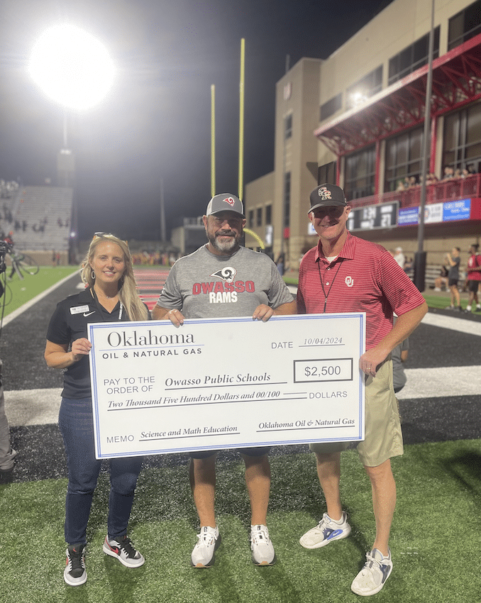At the Owasso at Union football game, Owasso Principal Tiffani Cooper and teacher Sean Nading were presented a check for Science and Math education for Owasso High School by the people of Oklahoma Oil & Natural Gas. and were also in attendance for the presentation.